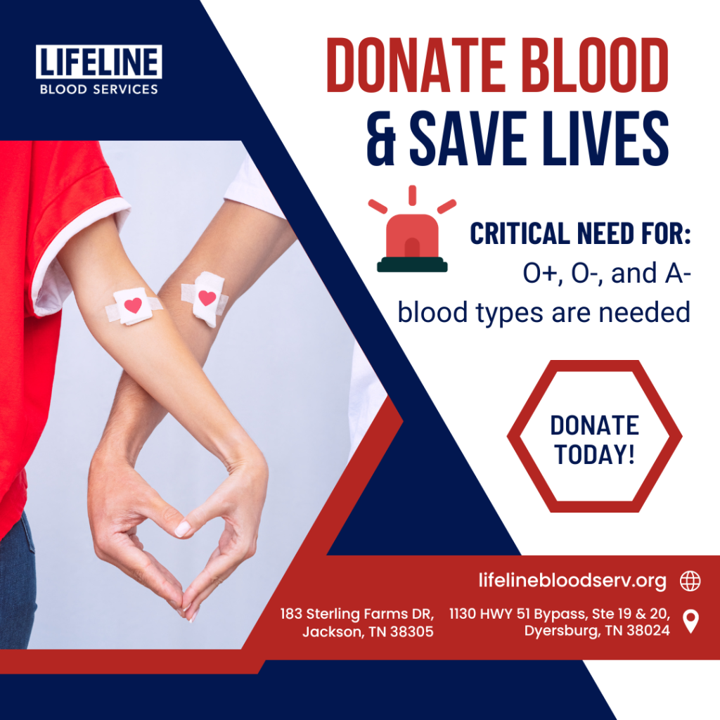 Is your blood type O positive, O negative or A negative? LIFELINE Blood Services needs your help and has a critical need for these 3 blood types. Don’t wait. Someone needs your help. Make your life saving contribution today- LIFELINE is located in North Jackson close to Jackson Clinic North is open until 6pm today or you may find a mobile blood drive in your community by visiting their calendar at lifelinebloodserv.org