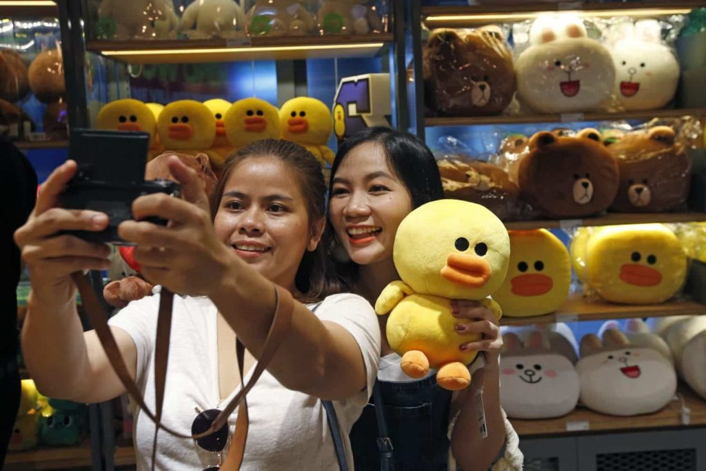 Much of Line’s appeal comes from its stickers that can be attached to messages, especially the company’s anthropomorphic animal figures, such as Brown the bear and Cony the rabbit. Line Village is located in Siam Square, for decades a hangout for young Thais enthralled with fashion and the culture of cute — there is already a Hello Kitty cafe located there.
