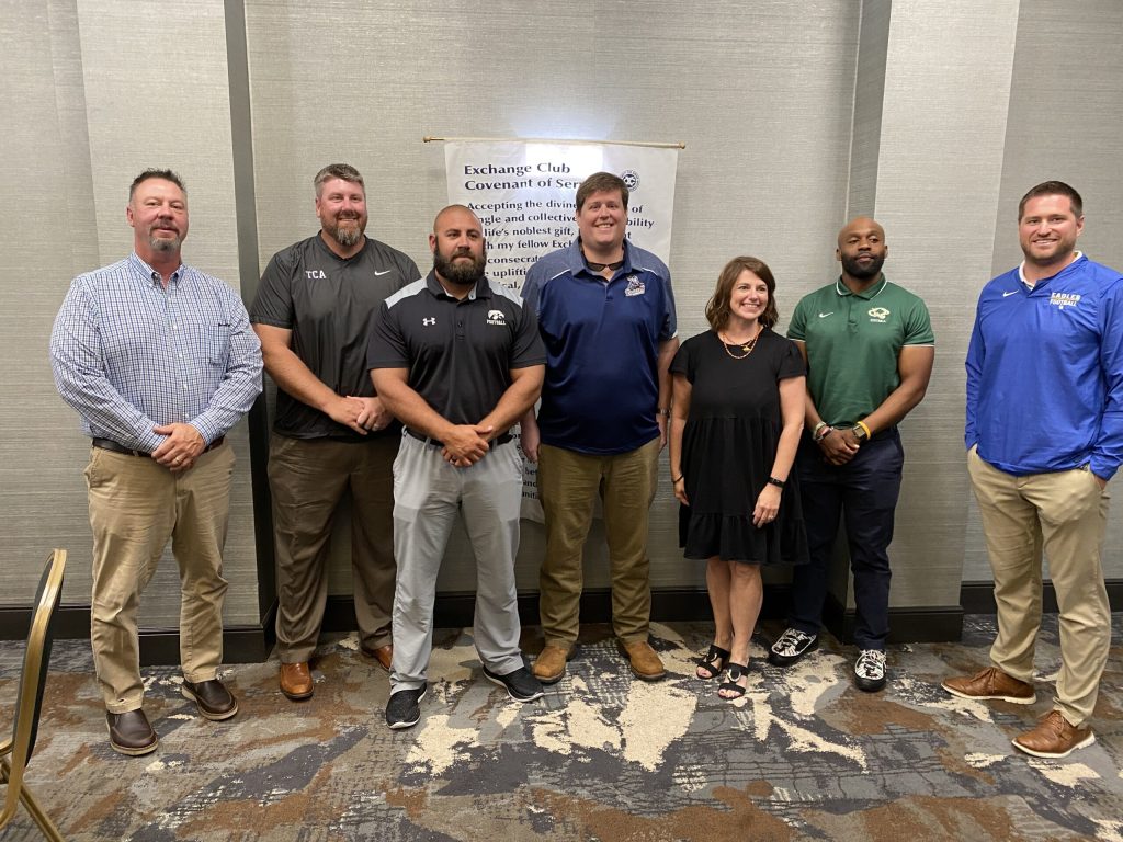 Five Jackson high school football coaches visited with the Jackson Exchange Club during its weekly meeting at the DoubleTree by Hilton Hotel, Tuesday.