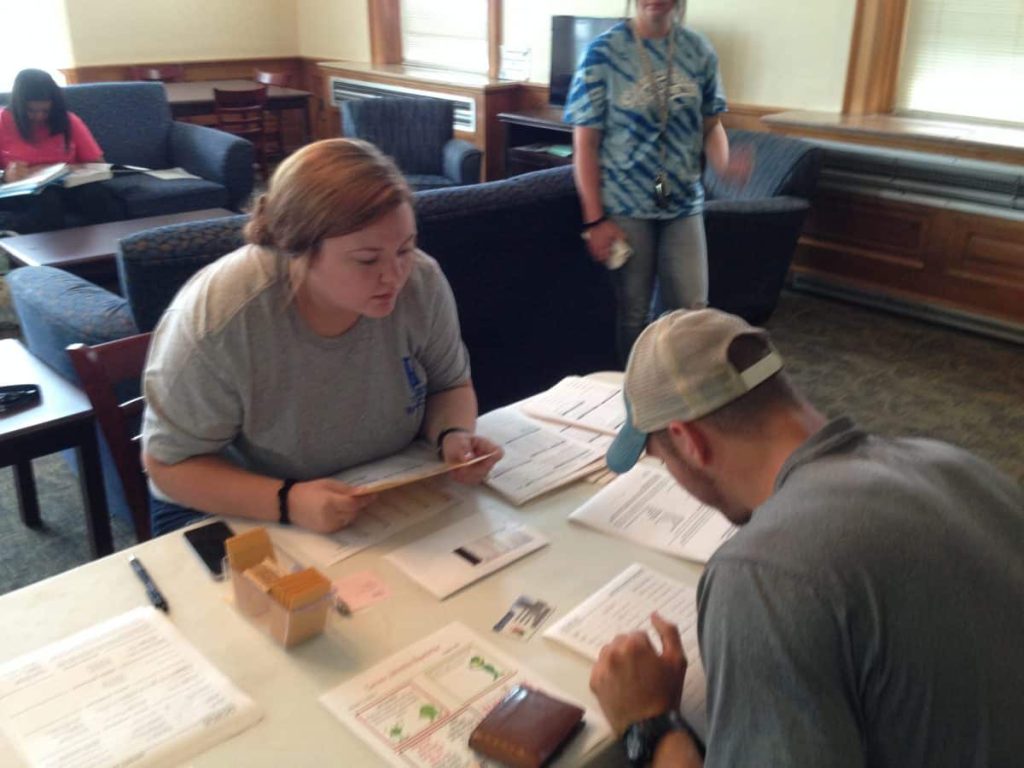 (PHOTO: Taylor Sisk, a resident adviser, helps Chase Boehms from Dyersburg check in at Carney-Johnston Hall)