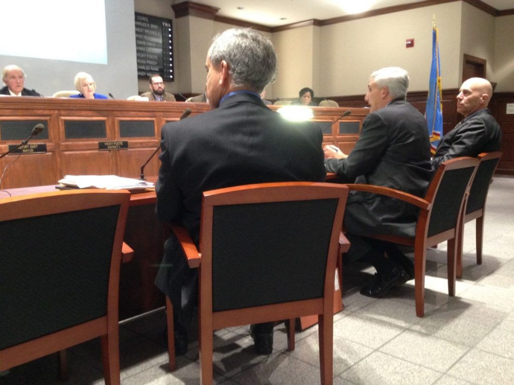 (PHOTO: Lewis Cobb, attorney for the City of Jackson, left, Robert R. Campbell Jr., center, and David Freeman, right, discuss the proposal of a new hotel/conference center near The Ballpark at Jackson)
