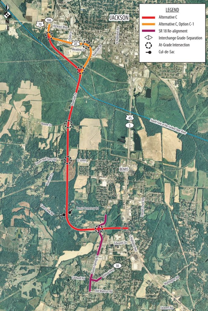 The project, described from south to north, is as follows. A new interchange would provide access to the new alignment from existing US 45 (South Highland Avenue) and would require right-of-way and easements. The alignment begins on the west side of US 45 north of Edwards Drive and the Bonwood Industrial Park and ends on the north at Airways Boulevard (US 70/SR 1) southwest of downtown Jackson. This includes ramps over the West Tennessee Railroad (WTNRR) connecting the bypass to existing US 45 and a connector to SR 18 in the vicinity of Raines Springs Road. It also includes two optional alignments for connecting to existing Airways Boulevard on the north end of the project (Options C and C-1). The project is approximately 6.78 miles long.
