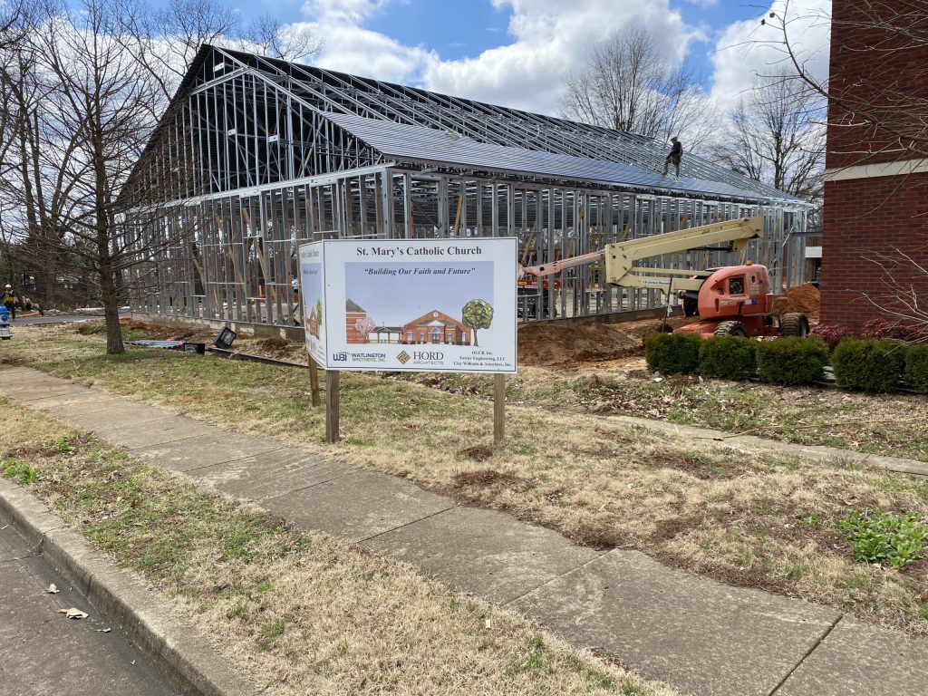 Construction continues on a new parish office at St. Mary’s Catholic Church, 1665 U.S. Highway 45 Bypass.