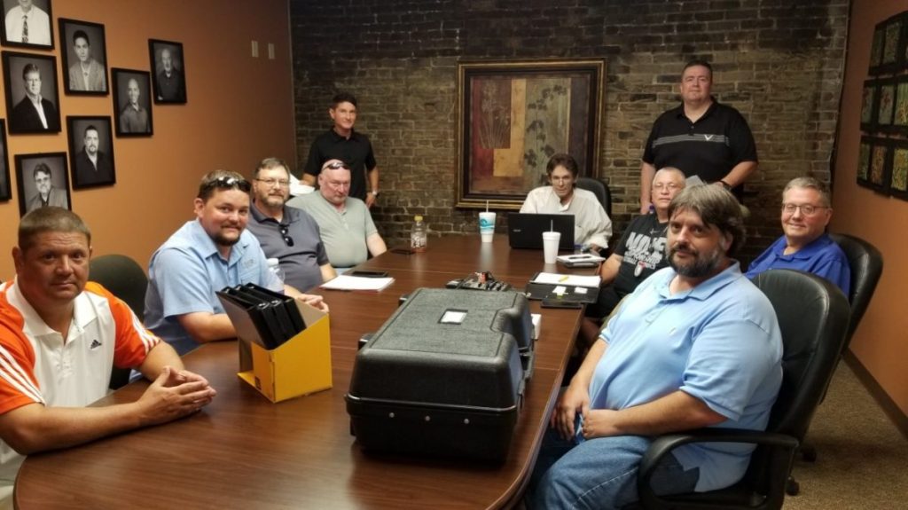 (PHOTO: Seated from left, David Wade, Steven Rich, Paul Schulze, video production, Jackson Christian School, Michael Doles, Michael Osburn, technical support, Joe Holloway, Dan Hughes and Drew McGruder, production manager. Standing, Dan Reaves, left, and Sea Bass)