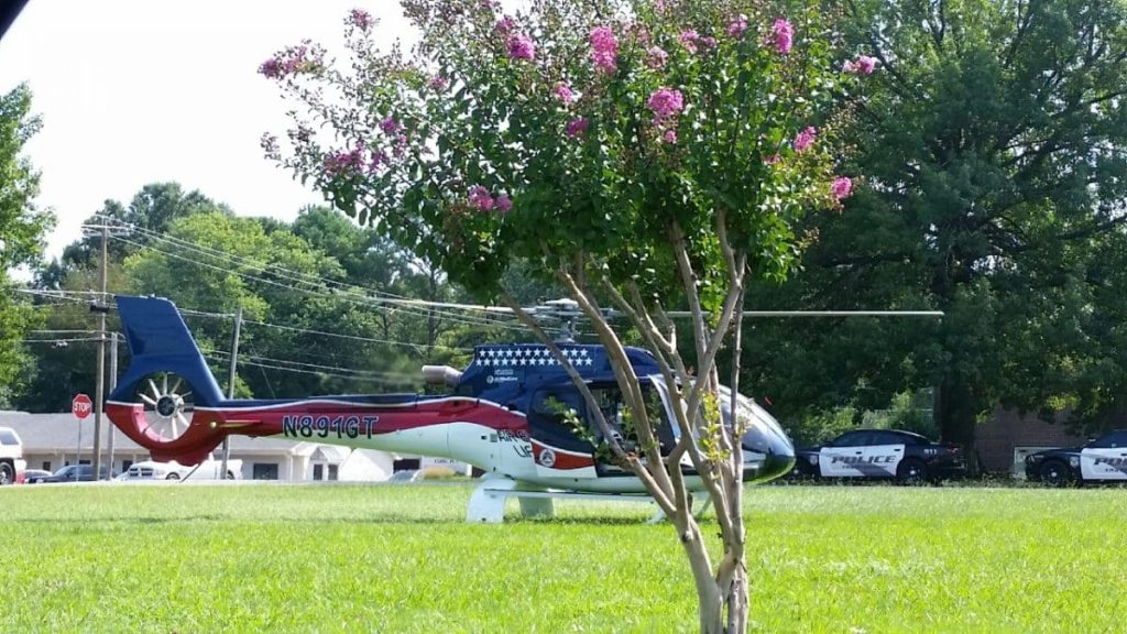 (PHOTO: Air Evac Helicopter airlifted stabbing victim to Memphis – courtesy Susan Davie-Cogdell, NEWS/TALK 101.5 FM)
