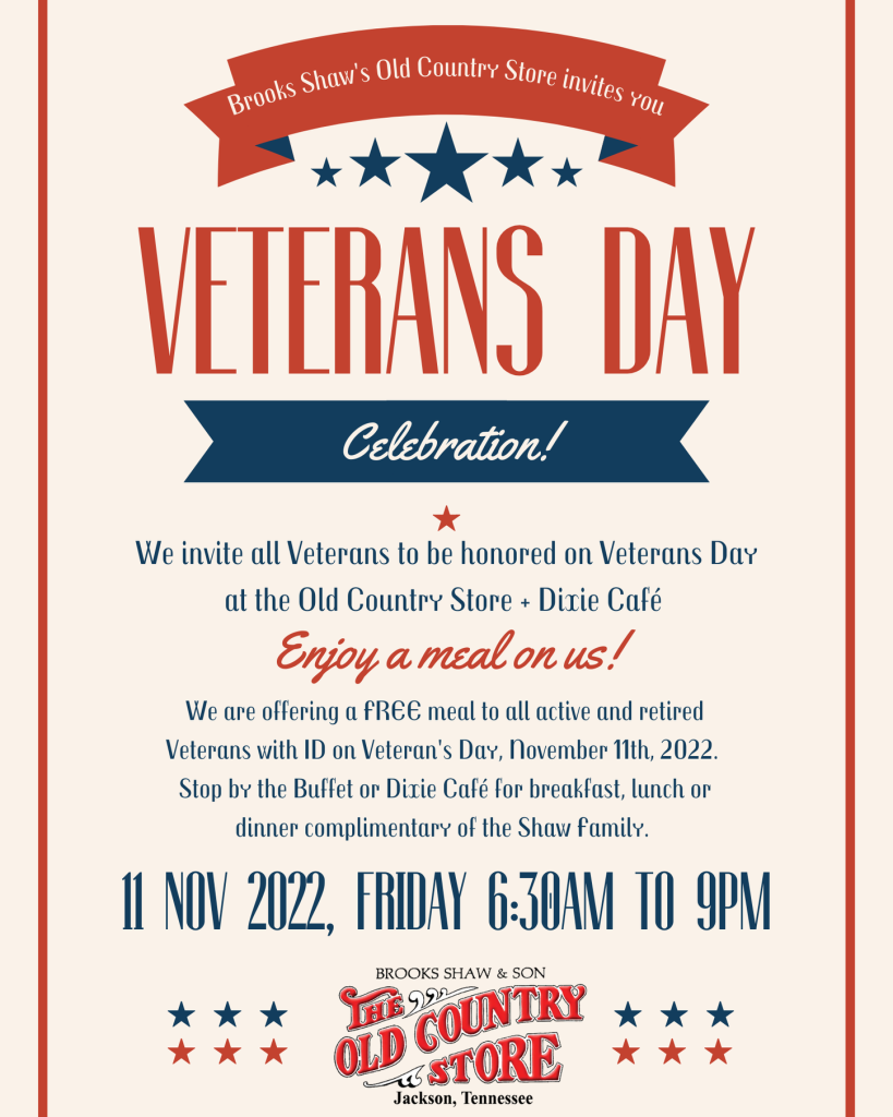 Jackson, Tennessee – Brooks Shaw’s Old Country Store and Casey Jones Village will honor veterans and military members with a choice of either a complimentary breakfast, lunch or supper at the buffet or from the Dixie Cafe Friday, Nov. 11, 2022, in recognition of Veterans Day.