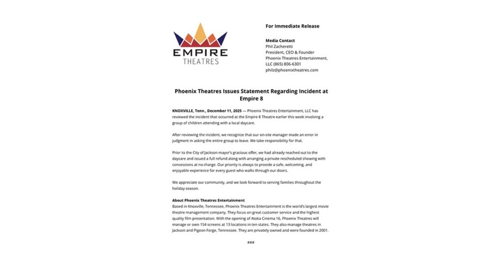 Phoenix Theatres Issues Statement Regarding Incident at Empire 8