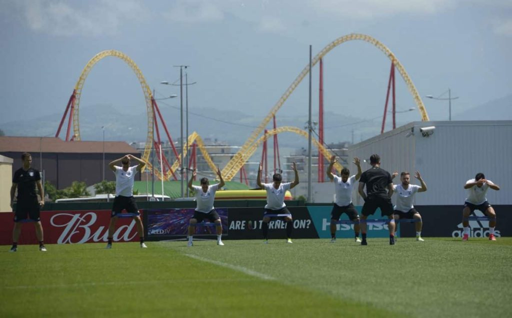 It’s not the only training ground in Sochi that provides spectacular images. The facility used by Germany on the other side of the Adler district is next to a theme park, and screams from the roller coaster can be heard as players go through their training drills.