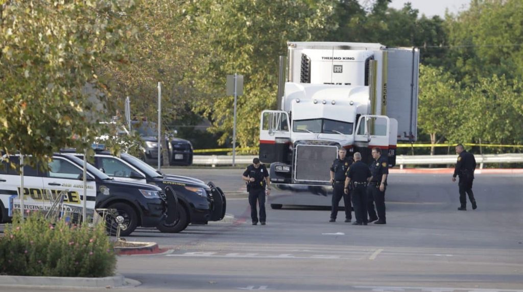 SAN ANTONIO (AP) — Authorities called to a Walmart parking lot in San Antonio overnight found eight people dead and 20 others in dire condition in the back of a sweltering tractor-trailer, in what police are calling a horrific case of immigrant smuggling.