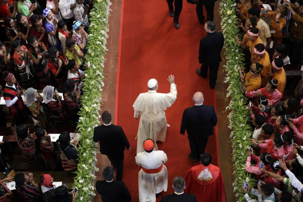 In his final event in Myanmar, Francis celebrated Mass in Yangon’s St. Mary’s Cathedral for young Catholics. The young worshippers, many dressed in the traditional clothing of their ethnic groups, leaned out to touch or kiss Francis’ hand as he slowly walked by.