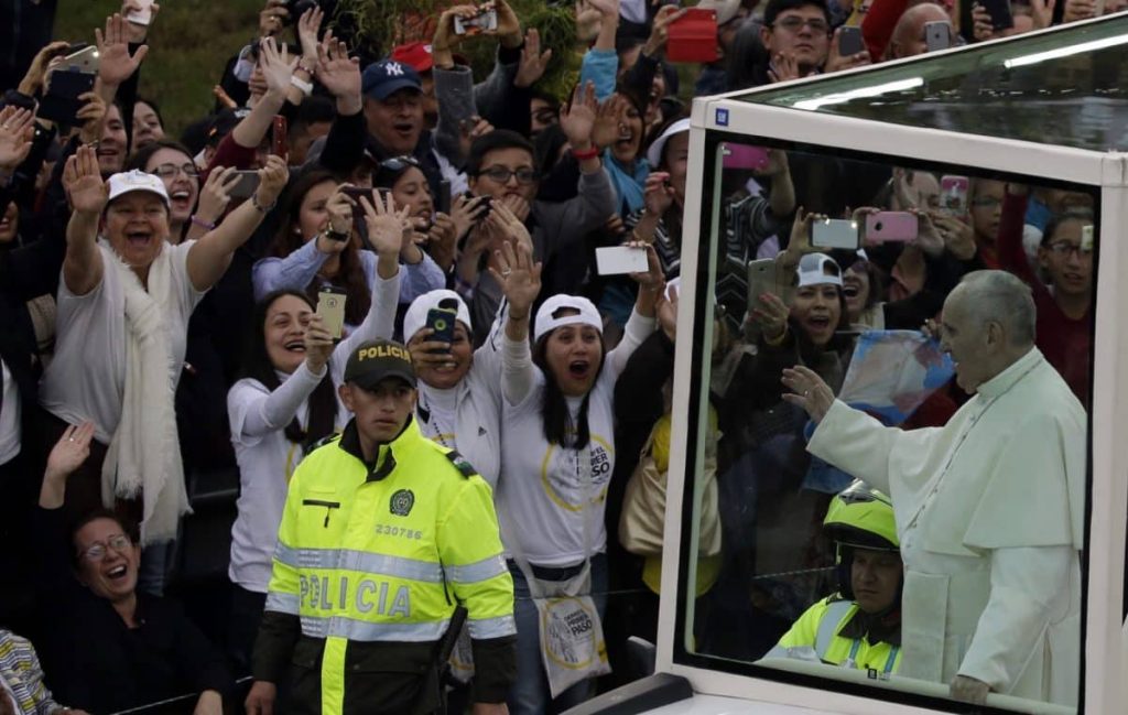With no police line in sight, Francis was practically mobbed by well-wishers, though he seemed to revel in the outpouring of emotion from people showering him with flowers, red-yellow-and-blue Colombian flags and shouts of “Viva Francisco.” He even gave a few high-fives to some youths who got a little too close.
