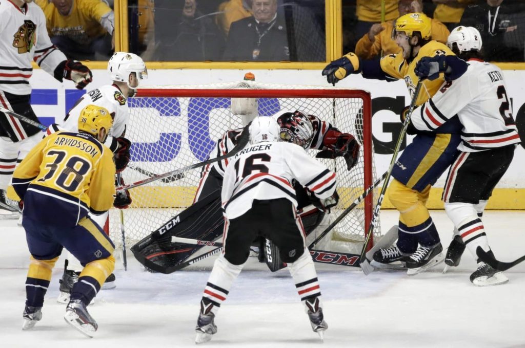 Forsberg started the rally. He scored on a wrister hitting the puck in the air past Crawford, who was caught having turned around in the crease, at 4:24. Blackhawks forward Richard Panik argued the puck went off the netting, but the play was called a good goal after a review.