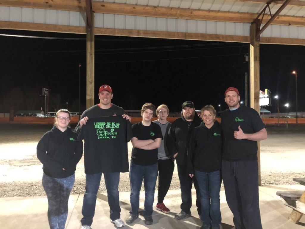 (PHOTO: Randy Santel, second from left completed the ‘Big Burger Challenge,’ at KC Finn’s, Wednesday. Charlie Finn and wife Kathy, second and third from the right co-own the restaurant)