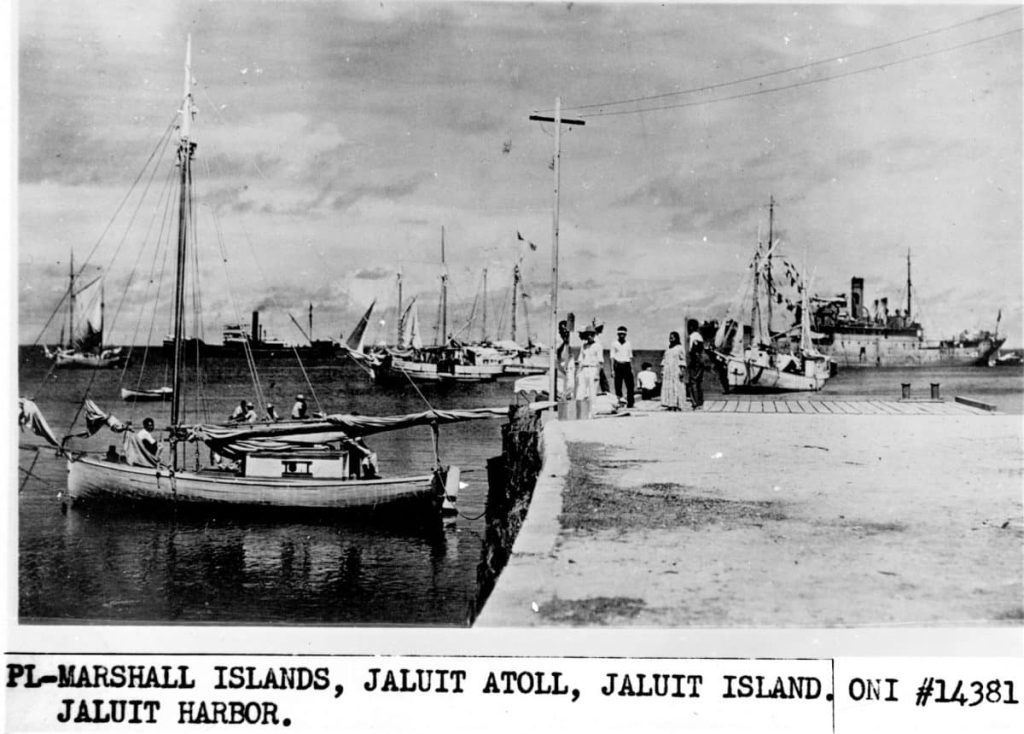 The undated black-and-white photo is of a group of people standing on a dock on Jaluit Atoll in the Marshall Islands. One of the people seems to be a slim woman with her back to the camera.