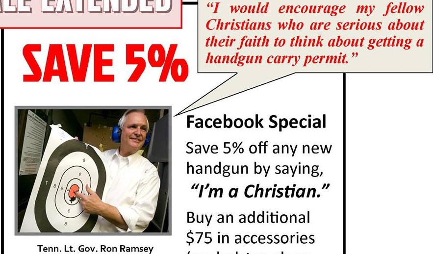 (Kingston Tenn) — In the wake of the Oregon college massacre in which 10 people, including the gunman, were killed, an east Tennessee gun store owner is offering a discount to customers who say they are Christian. The offer follows comments by Tennessee Lt Gov Ron Ramsey. “Ron Ramsey had a good point,” said Williams. “Christians need to arm up.”