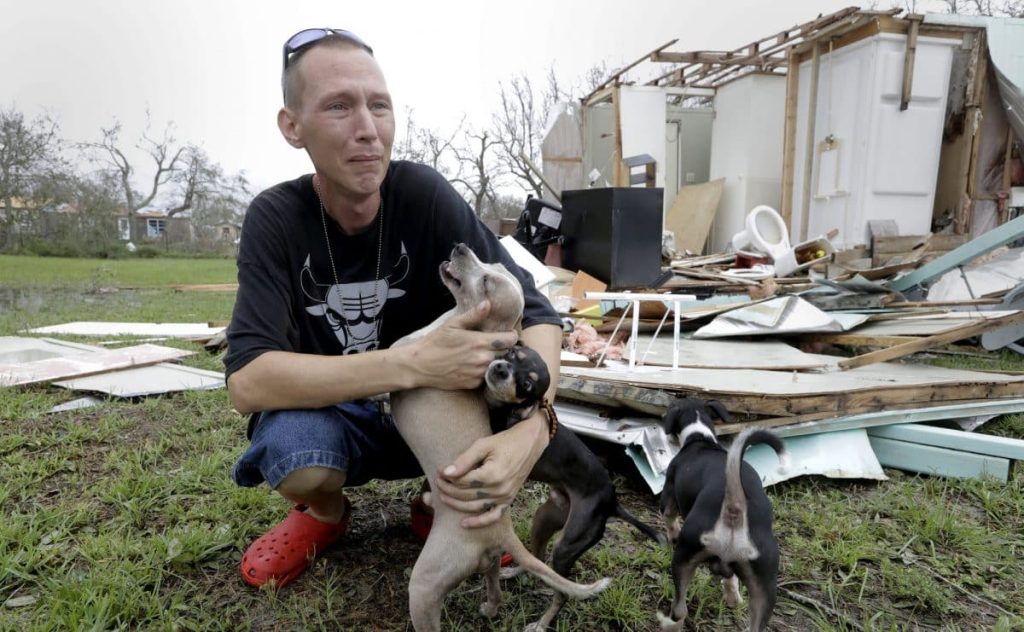 “We’re just a low-income family and this hurts,” he said after they left, holding back a sob that later came when he squatted in his puddled backyard, surveying the roofless, wall-less back of his trailer, his rat terriers heaping on affection.