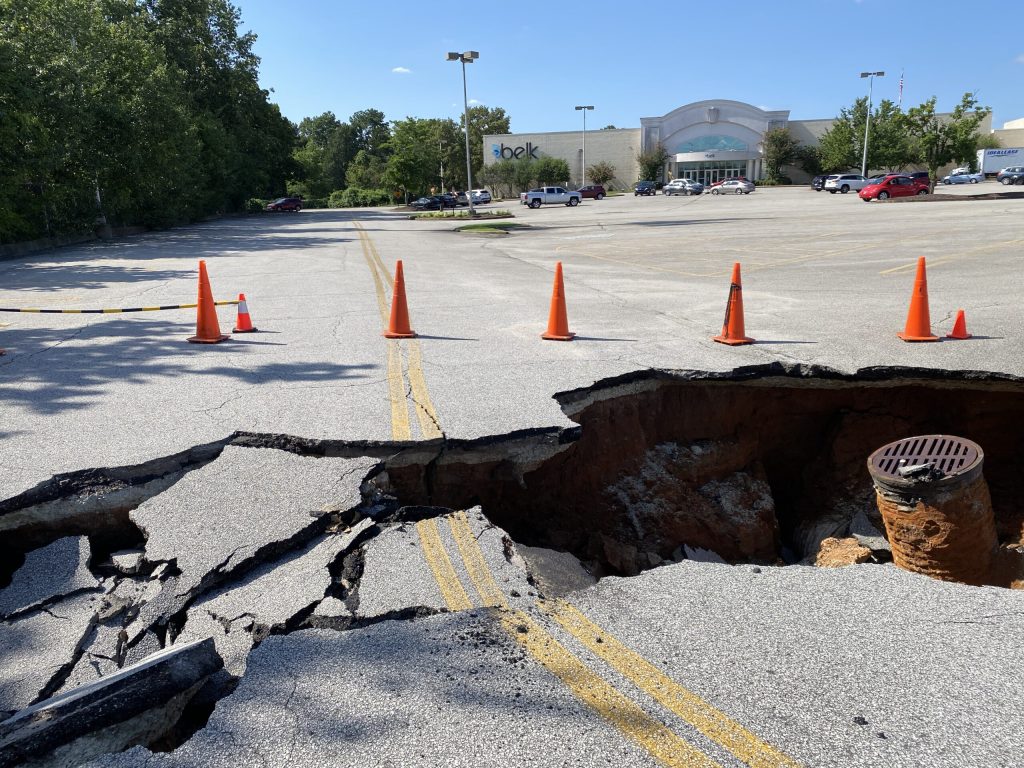Management could not be reached for comment, but a section of the parking lot has collapsed – south of Belk, west of JCPenney – but cones are in place to alert traffic.
