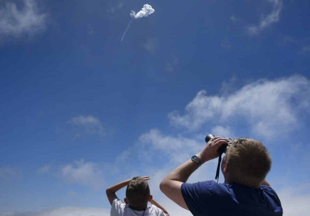 About 7 minutes after liftoff, the rocket’s first-stage booster returned to earth and landed on a floating platform on a ship in the Pacific Ocean, while the rocket’s second stage continued to carry the satellites toward orbit.