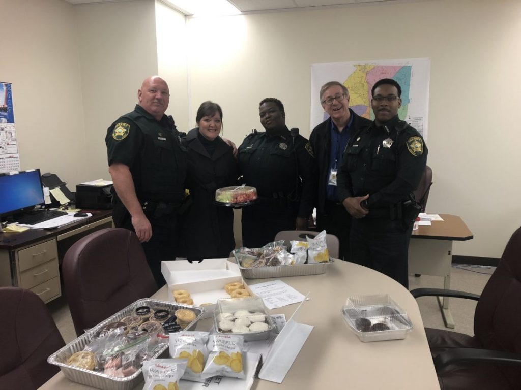 (PHOTO: Tammy Buchanan ‘Blue Strong 5,’ is pictured second from left delivering treats to the Madison County Sheriff’s Office. Tom Mapes, the PIO of the MCSO is second from the right)
