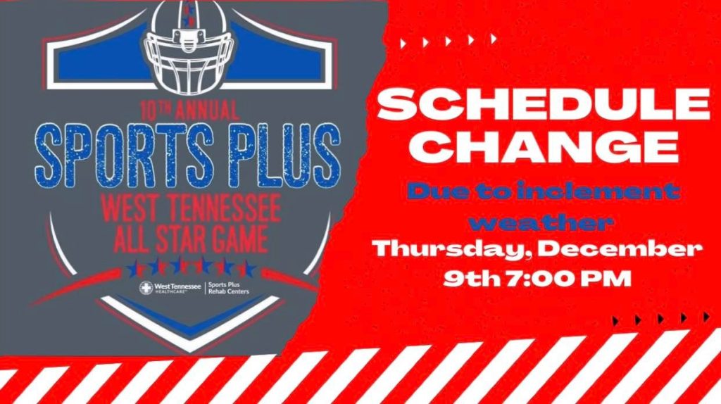 The Sports Plus West TN All-Star high school football game – 7 p.m., University School of Jackson – has been moved to THURSDAY, December 9 due to the threat of inclement weather.