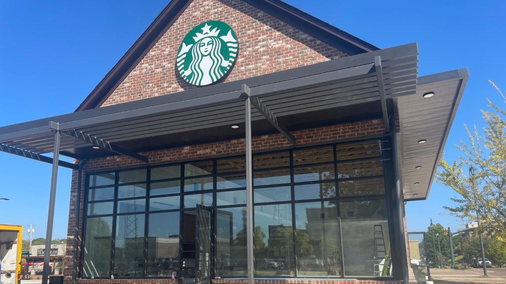 The Starbucks features an outdoor patio space and large windows to create a “Jackson Walk” look.