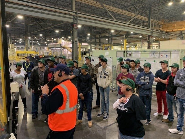 (PHOTO: Scott Hastings, Toyota Bodine production manager in orange vest, takes students from Carroll County Technical Center on tour of Jackson facility during Manufacturing Day, Friday – courtesy Kelsea Merriweather 2018 MBA-HR Candidate| Bethel College of Professional Studies, Bethel University)