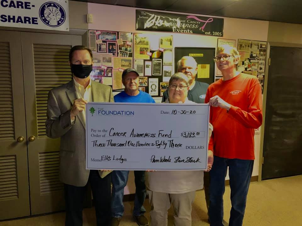 This gift is the 15th annual gift to the Breast Cancer Awareness Fund at the Foundation. The tradition of giving to the Breast Cancer Awareness fund began when Kay Pruett began to work with the cause because her mother was diagnosed with breast cancer. Since that time, The Elks Lodge has given more than $58,000 to the fund.