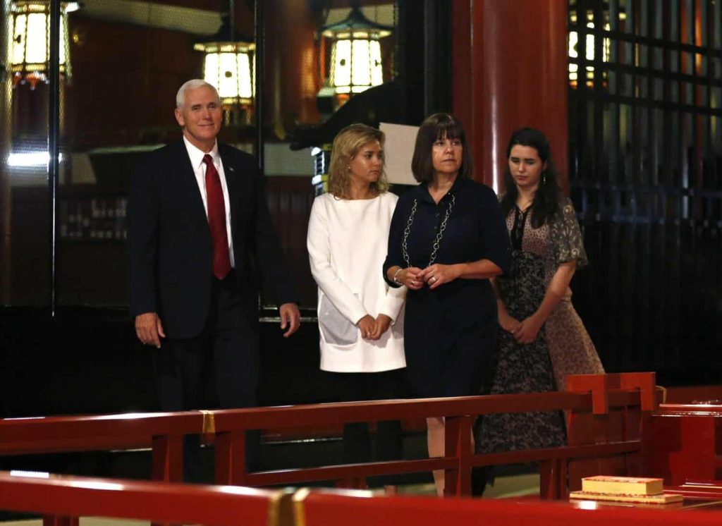 Pence, his wife Karen and two daughters walked inside the main hall of colorful Senso-ji temple Tuesday as incense burned.