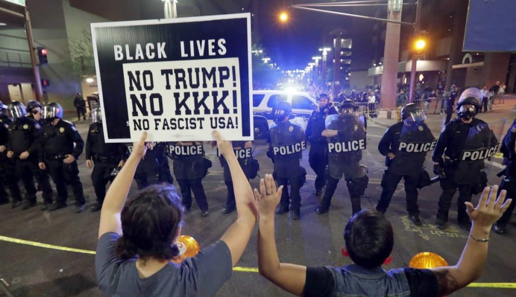 Phoenix police lobbied what they say is pepper spray at protesters who threw rocks and water bottles at them as President Donald Trump’s rally broke up.