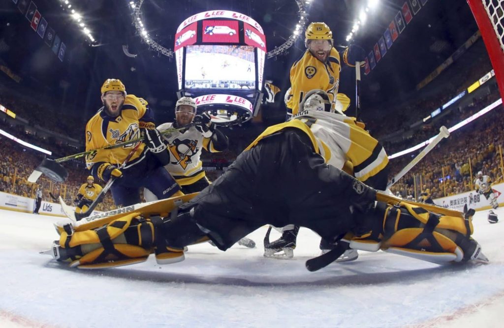 Moments later, Nashville goalie Pekka Rinne stopped Sidney Crosby’s backhander on a breakaway, then slid back to his right to stop Guentzel in a frantic scramble.