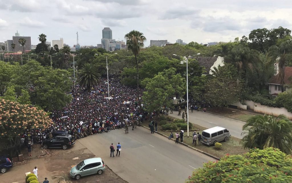 Soldiers have begun approaching the several thousand demonstrators in Zimbabwe’s capital and urging them to head to the Zimbabwe Grounds, where speeches are set to be delivered.