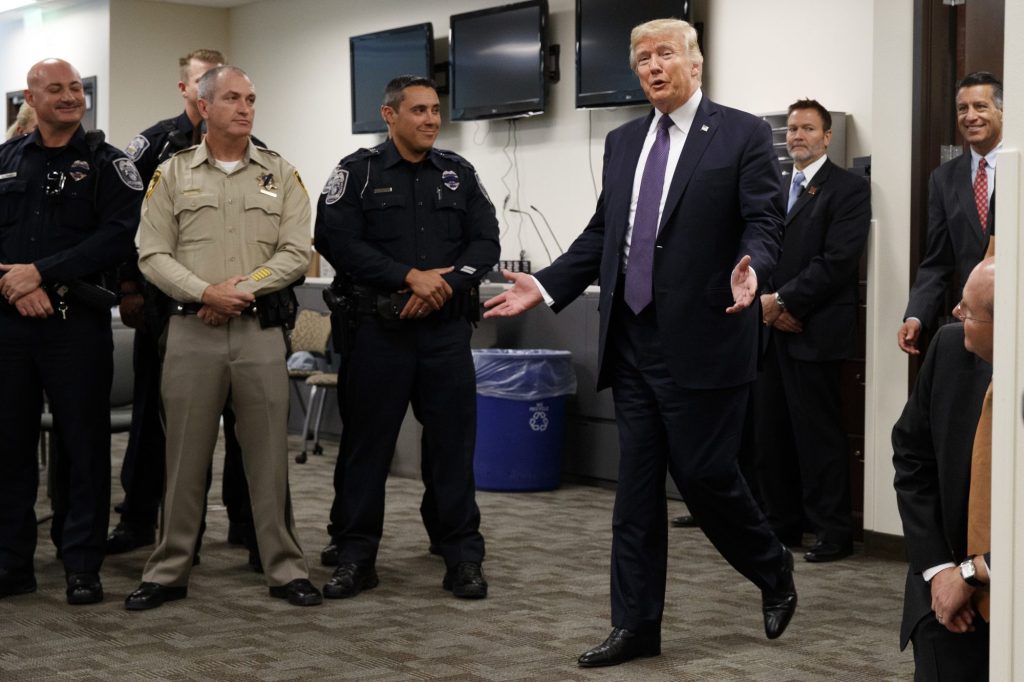 At Las Vegas Metropolitan Police Headquarters, Trump said, “You showed the world and the world is watching.” Trump and his wife, Melania, were meeting with victims, doctors, police, dispatchers and others who responded to the tragedy, when a gunman in a hotel tower opened fire on an outdoor country music festival. Fifty-nine people were killed and more than 500 injured — some from being shot and others from the chaotic escape.