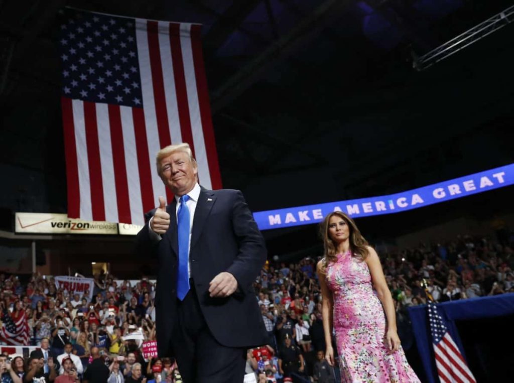 First lady Melania Trump is introducing her husband at a rally in Youngstown, Ohio and telling the crowd that he’ll never back down.
