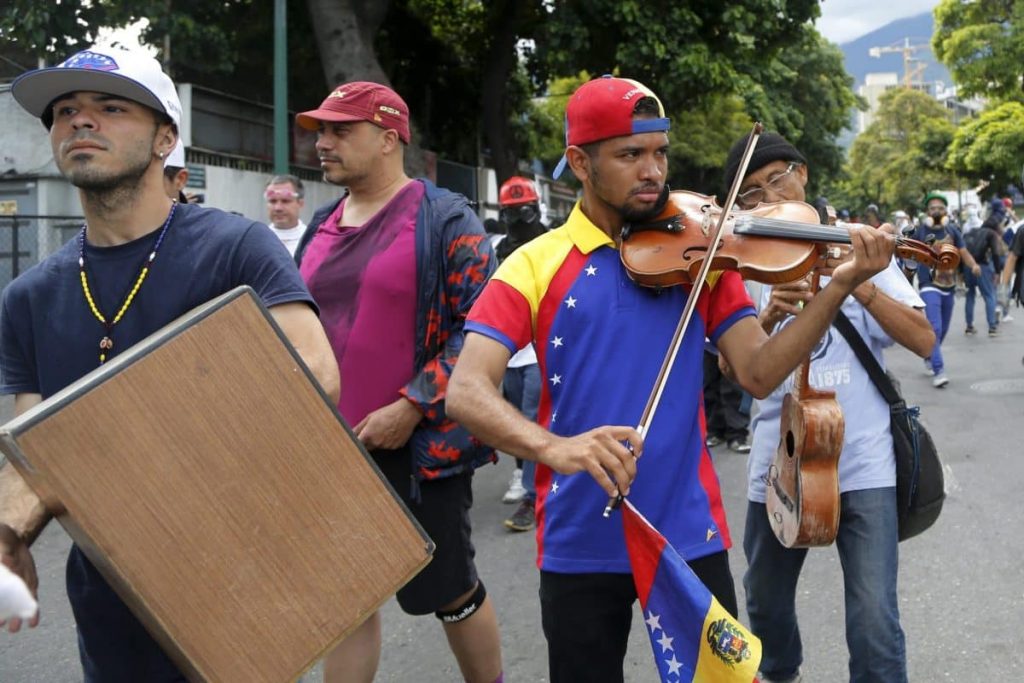 Arteaga has been a fixture at demonstrations against President Nicolas Maduro, playing the national anthem on his violin as authorities launch tear gas in his direction.