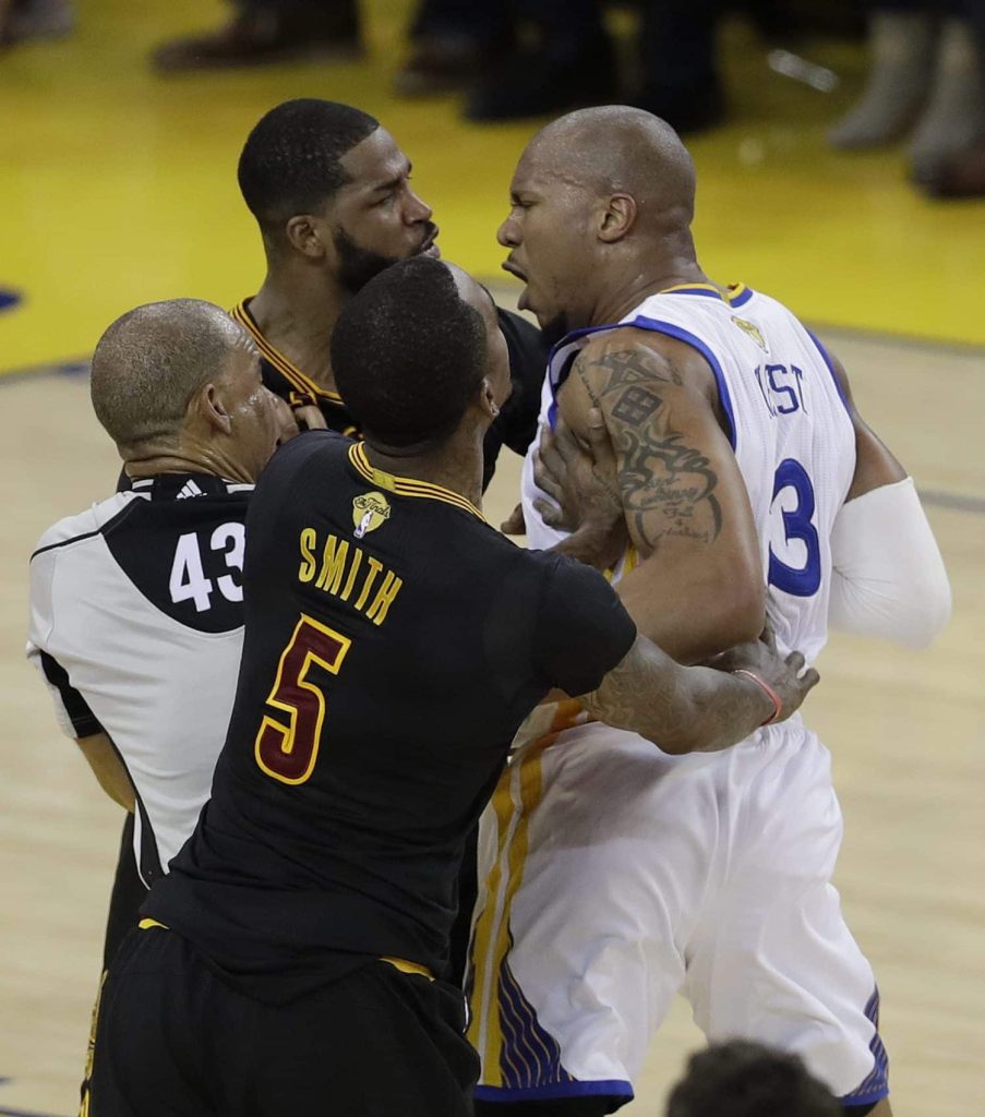 Tempers flared when Kyrie Irving tied up David West on a loose ball. West shoved Irving to pick up a technical foul, then went chest-to-chest with Tristan Thompson. After an extended review of the confrontation, officials Danny Crawford and Ed Malloy assessed technical fouls to Thompson and Smith as well and did not give West a second technical, which would have resulted in an ejection.