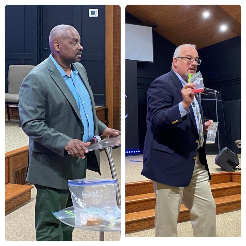 (PHOTO: Johnny Dodd, left, and Tommy Farmer, at I-CARE event, Wednesday)