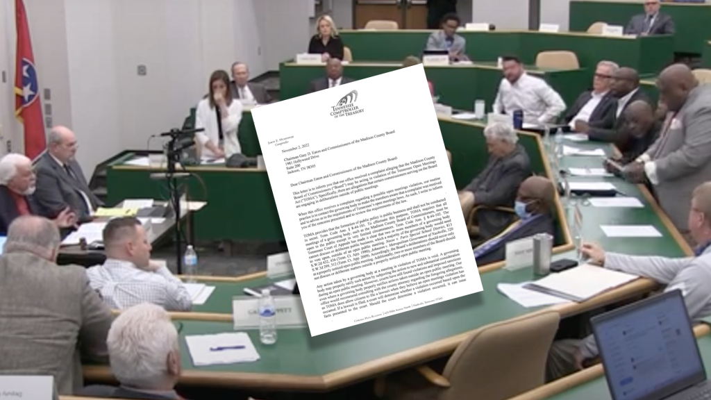 Maria Bush, Open Records Counsel, sent a letter on behalf of Jason Mumpower, Tennessee Comptroller of the Treasury, addressed to Deaton and the Commissioners of the Madison County Board after the Comptroller was informed of the meeting.
