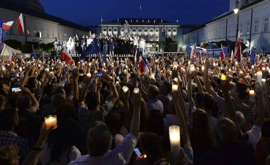 Opposition lawmakers and celebrities joined the crowd in front of the Presidential Palace in Warsaw as protesters held up candles, waved national and European Union flags and chanted “free courts” and “democracy.”