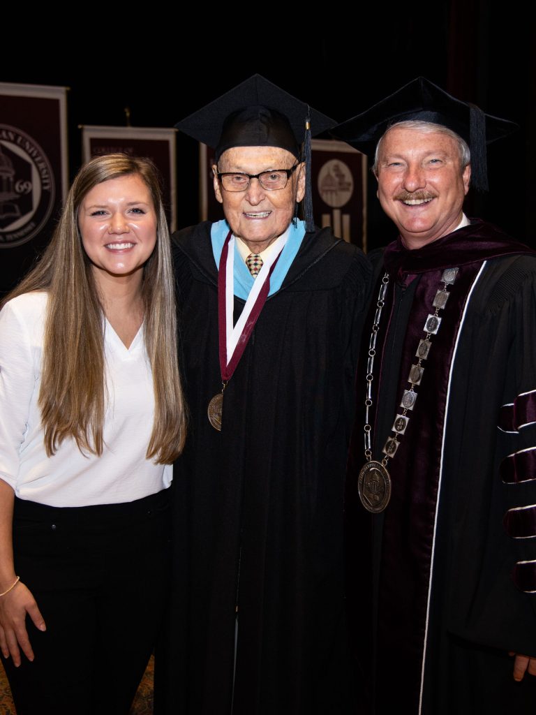 (PHOTO: SGA President Kayley Wadlington, Brig. Gen. Billy B. Morgan and FHU President David R. Shannon stand together during annual Tolling of the Bell)