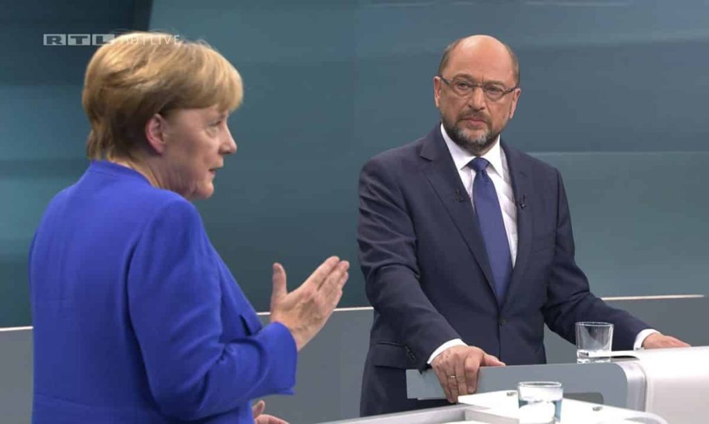 Polls show a double-digit lead for Merkel’s conservative bloc over Schulz’s center-left Social Democrats before Germany’s Sept. 24 election.