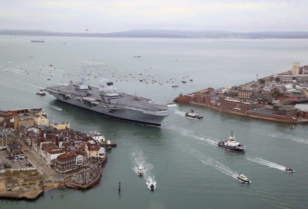 LONDON (AP) — Britain’s new flagship aircraft carrier HMS Queen Elizabeth has arrived at its home port in southern England to great fanfare.