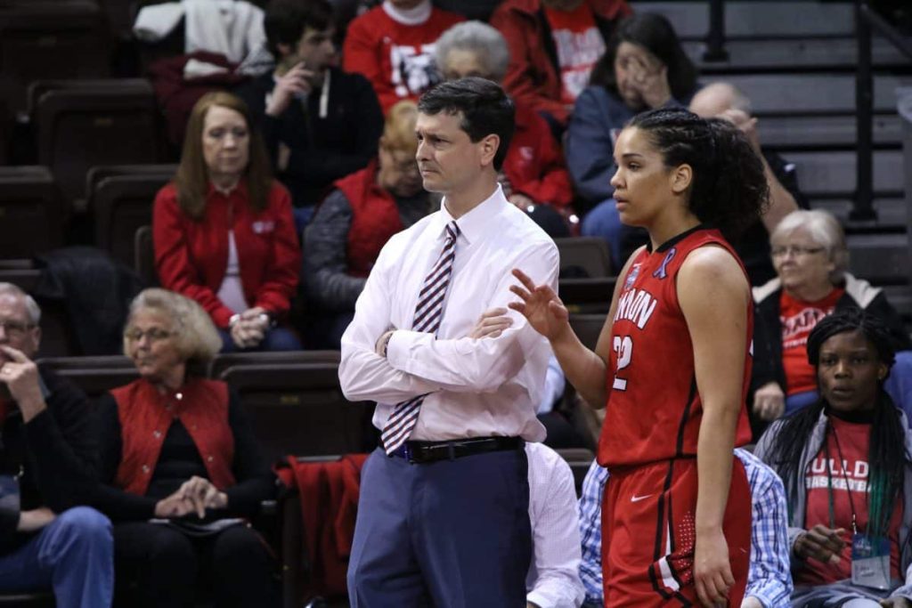 (PHOTO: Union coach Mark Campbell watches play during the NCAA Division II National Semifinal game between the Lady Bulldogs and Central Missouri – courtesy Union University Sports Communication)