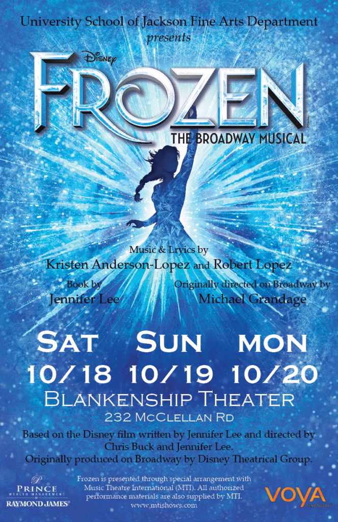 The Fine Arts Department at the University School of Jackson will become the first school in West Tennessee to present the original Broadway production of ‘Frozen,’ Saturday at 7 p.m., Sunday, 2 p.m., and Monday, 7 p.m. – October 18-20.