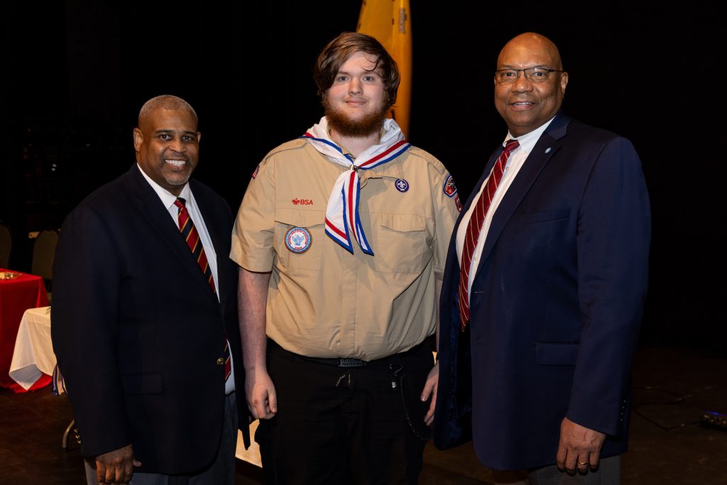 (PHOTO: (l to r – West TN Council BSA Executive Director Morio Snelling Sr.,  Oliver Jackson Oxford (National Eagle Scout Service Project of the Year Award) and James “JR” Ross (Outstanding Eagle Scout Award and was Class of 2023 Honoree) presented Oxford with his award)