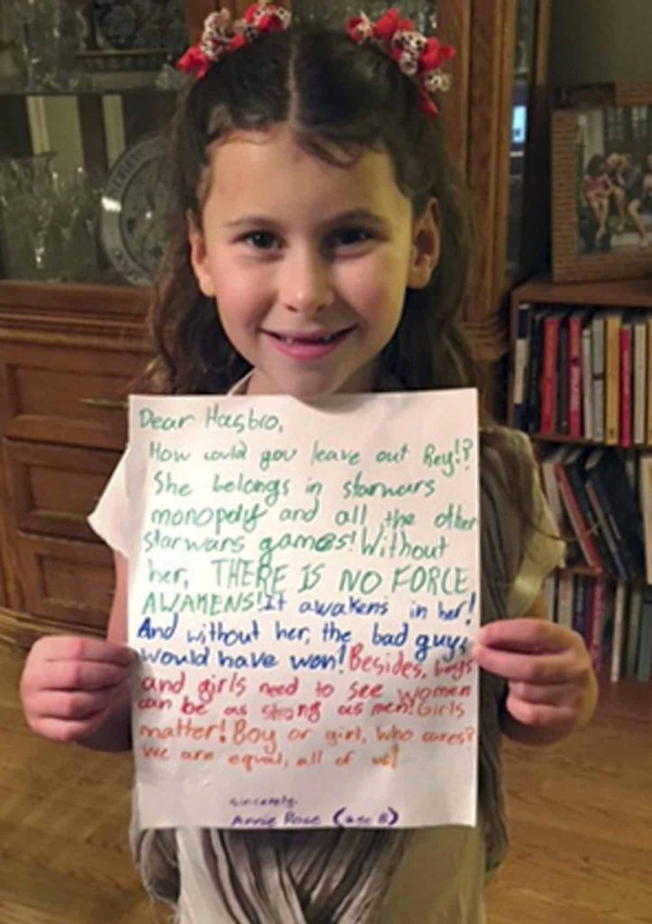 “Without her THERE IS NO FORCE AWAKENS! It awakens in her! And without her, the bad guys would have won! Besides, boys and girls need to see that women can be as strong as men!” wrote Annie Rose, who is now 10. “Girls matter!”