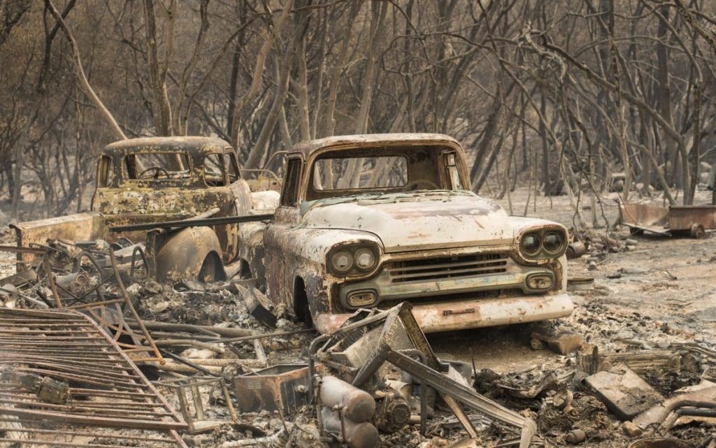 Burned-out pickup trucks were left in ashes, surrounded by charred, leafless trees. The metal frame of a mobile home and a vintage stove were left standing in scorched debris at one site.
